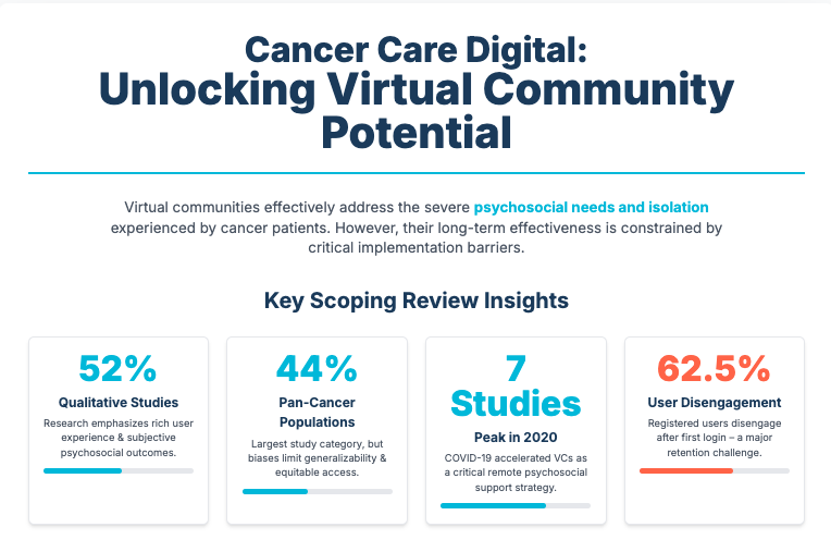 • Summary: This extensive review examines the challenges of implementing digital health communities. While valuable for patients, these tools often fail due to low user retention, lack of integration with existing health systems, and unaddressed data privacy concerns. Success requires organizational readiness and user-centric design.
