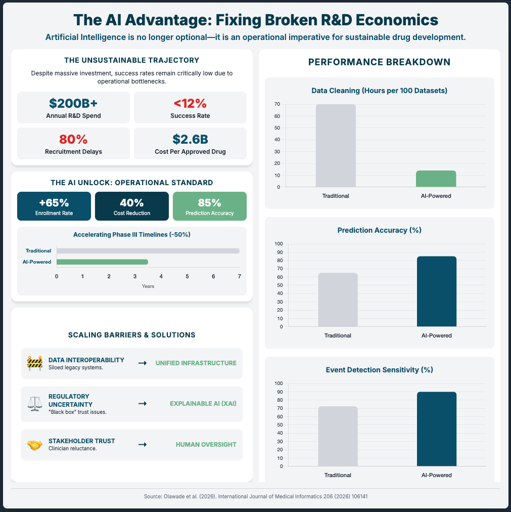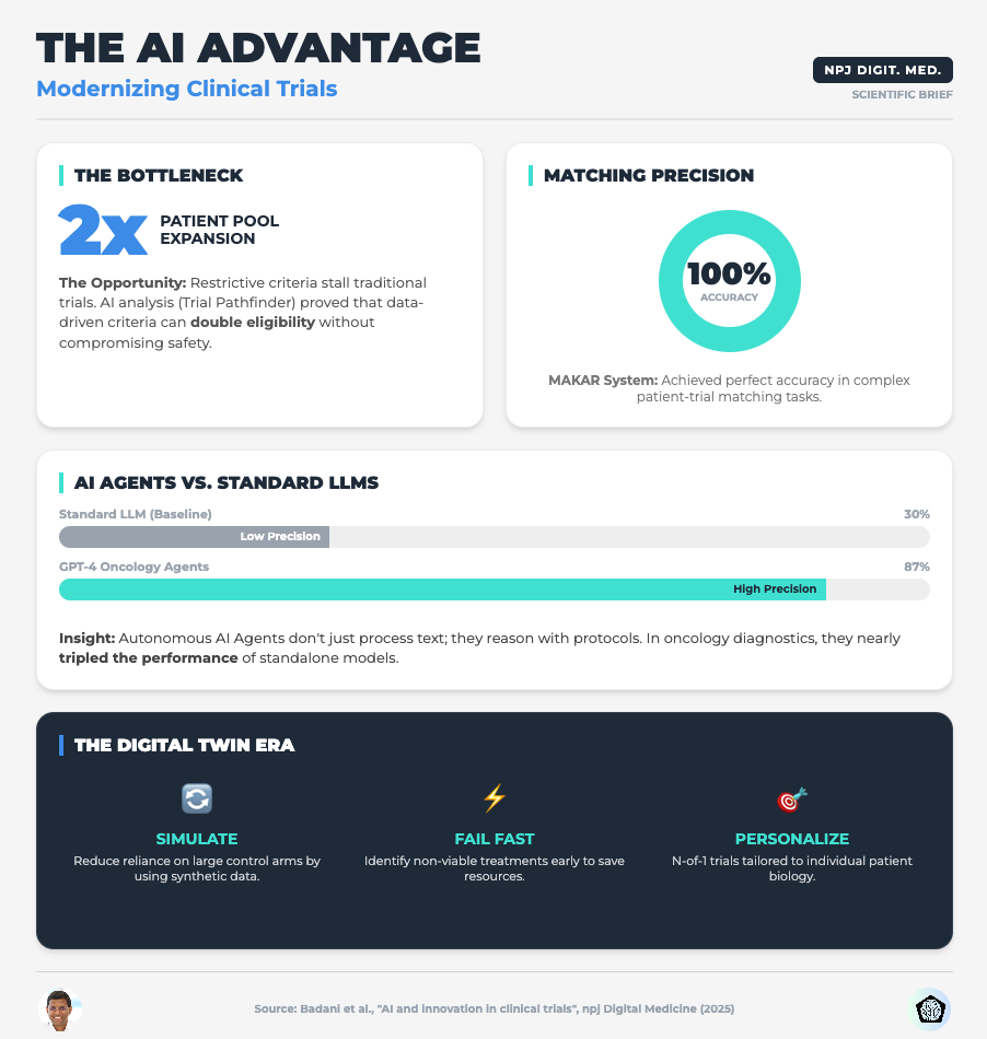 • Summary: This paper argues that the industry must shift focus from simply adopting powerful algorithms to mandating transparency and rigorous validation. It highlights how AI can optimize eligibility criteria using Real-World Data (RWD) and the use of Digital Twins for synthetic control arms.
