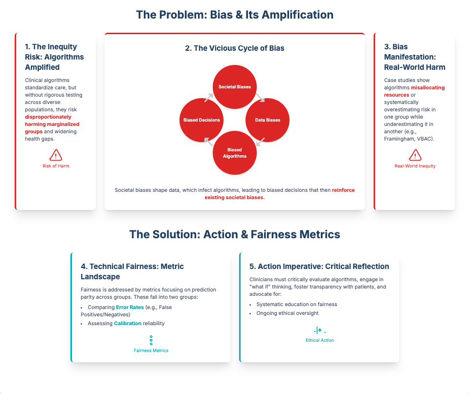 • Summary: This article is a critical look at how AI in healthcare can worsen health disparities if not carefully managed. It explains that algorithms trained on biased data often favor privileged groups, creating inequitable outcomes.1 The authors argue for rigorous evaluation, transparency, and integrating fairness metrics into the entire AI lifecycle.