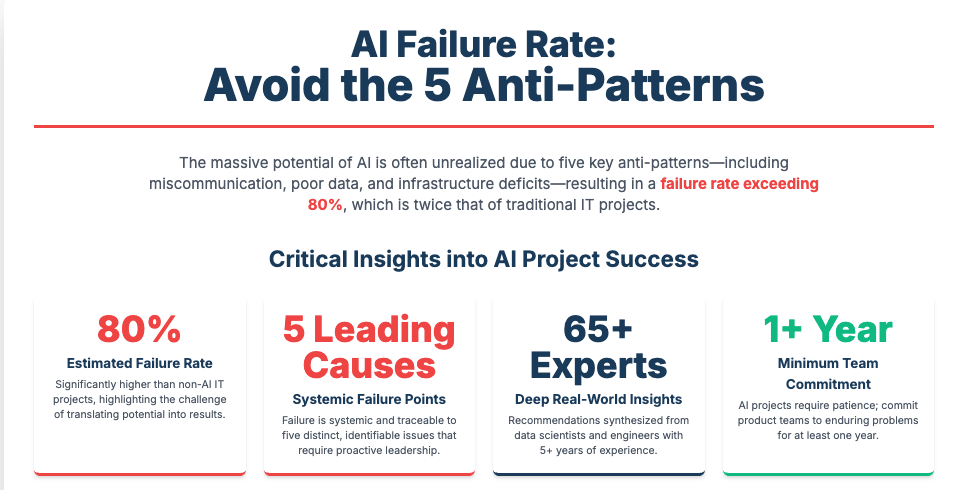 • Summary: Based on interviews with data scientists, this RAND report finds that over 80% of AI projects fail—double the rate of traditional IT projects.2 The top reasons are not technical, but strategic: miscommunicating the project’s purpose, insufficient data, weak infrastructure, and applying AI to the wrong problems.