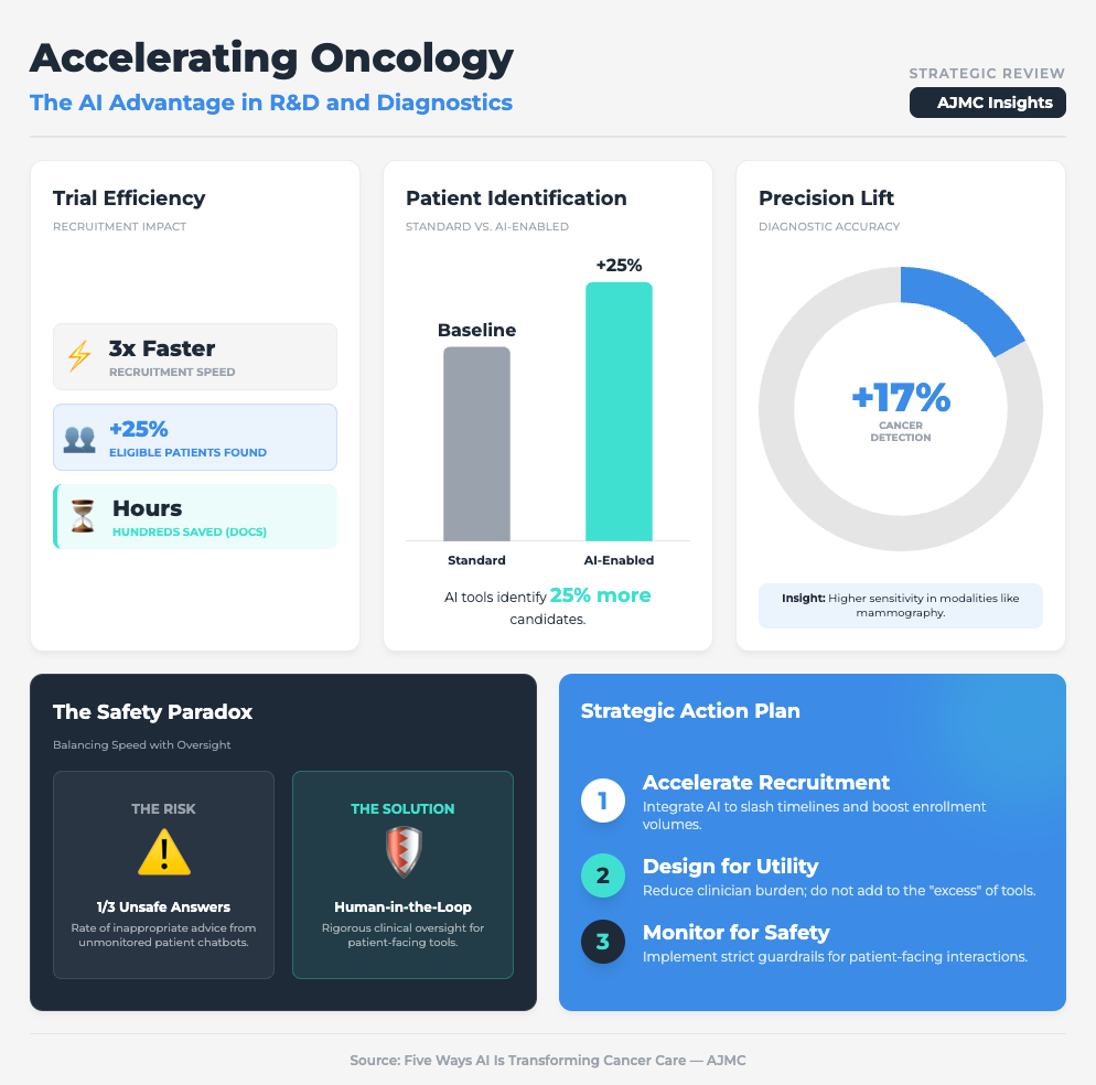 • Solve the accrual crisis (currently averaging 1.5 patients per cancer trial) by removing restrictive enrollment thresholds and utilizing multimodal AI to process unstructured patient data.