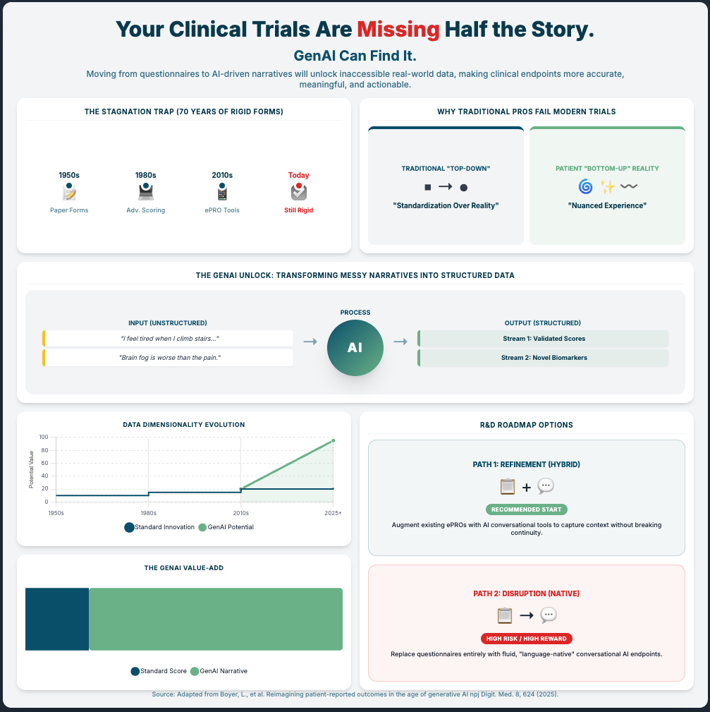 • Summary: Generative AI could revolutionize PROs by moving from static surveys to rich, narrative conversations. But it brings huge risks: hallucinations and bias. The only way to de-risk this is to build new validation methods and hybrid models.