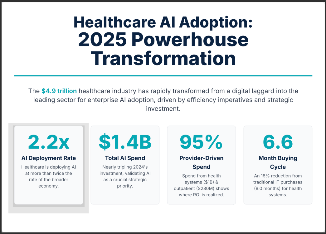 • Summary: This market analysis shows that while AI adoption is surging in healthcare, Pharma R&D is still in an experimental phase. Agile startups are capturing the majority of new AI spending, while established incumbents are integrating AI into their platforms. The key trend is that leading organizations are prioritizing mature, low-risk solutions with a fast ROI.