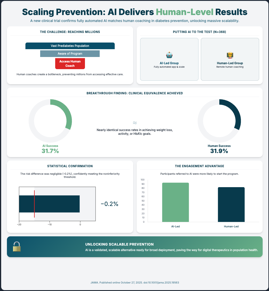 • Leverage AI for Scalability and Access: AI’s true power isn’t just matching human performance but overcoming logistical bottlenecks. While only 3% of eligible adults enroll in traditional DPPs, the AI-led trial drove significantly higher initiation (93.4% vs 82.7%) and completion (63.9% vs 50.3%).